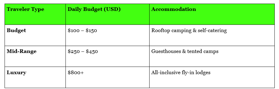 Pro Tip: Activities like helicopter flights ($150+), rafting ($120+), and park entry fees ($20–$40/day) add up quickly. Always keep a "contingency fund" for these.